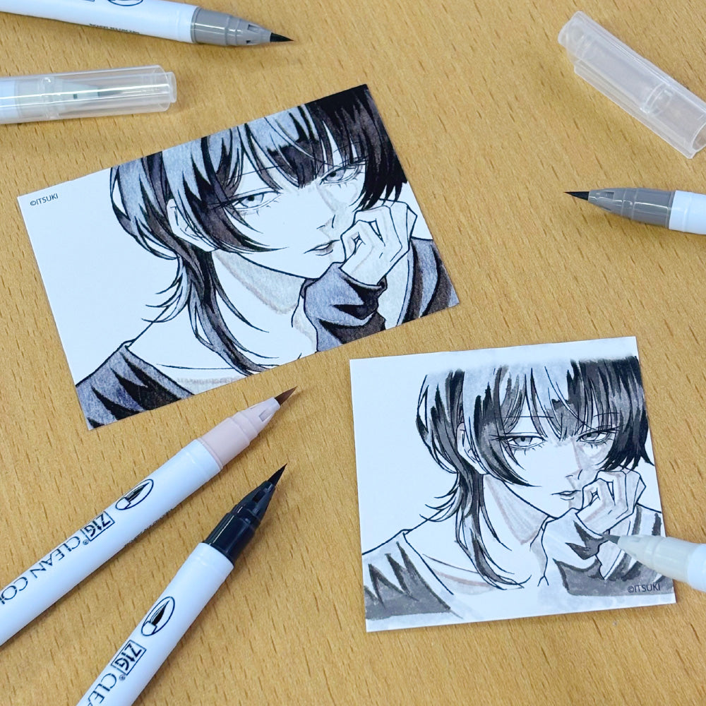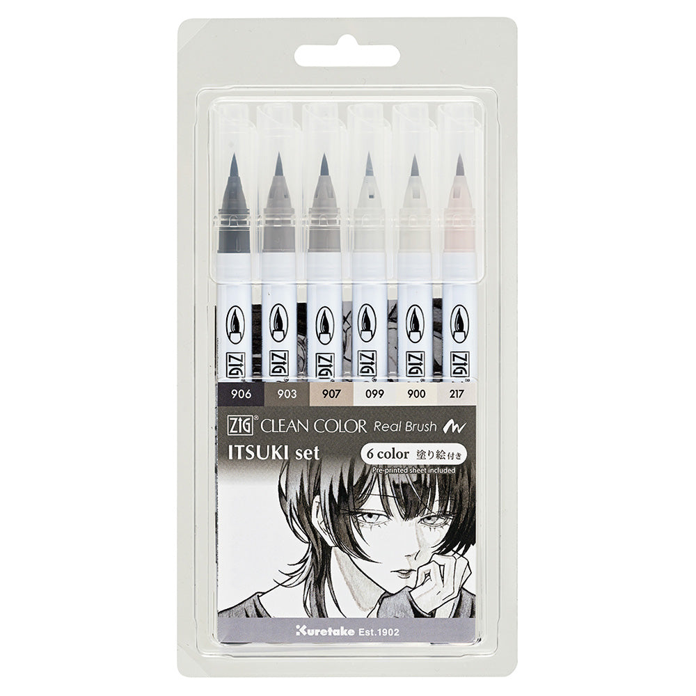 ZIGクリーンカラーリアルブラッシュとイラストレーター「イツキ」さんによるコラボセット。各パッケージには、セットの色味で描いた描きおろしイラストを掲載。さらに、イラストの塗り絵付きで実際に彩色も楽しめます。